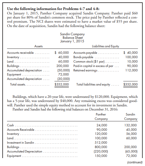 Parcel Sack Corporation Corporation Cash Accounts Receivable (net) Notes Receivable.. Inventory, August 31, 2017 Investment in Sack Corporation. Plant and Equipment . Accumulated Depreciation Other Assets 120,000 115,000 50,000 18,000 10,000 34,000 175,000 217,440 990,700 (170,000) 28,000 (80,000) (25,000) (300,000) (290,000) (110,000) 295,000 (85,000) Accounts Payable Notes Payable. Bonds Payable (12%) Common Stock ($10 par) Paid-In Capital in Excess of Par (50,200) (70,000) (62,000) Parcel Sack Corporation Corporation Retained Earnings, September 1, 2016 Sales .... Cost of Goods Sold. Selling and General Expenses. Subsidiary Income.. Interest Income.. Interest Expense.. Gain on Sale of Equipment. (498,850) (920,000) 598,000 108,000 (23,040) (118,000) (240,000) 132,000 80,000 (800) 37,750 (63,000) 90,000 Dividends Declared. 7,000 Totals Use the following information for Problems 4-7 and 4-8: On January 1, 2015, Panther Company acquired Sandin Company. Panther paid $60 per share for 80% of Sandin's common stock. The price paid by Panther reflected a con- trol premium. The NCI shares were estimated to have a market value of $55 per share. On the date of acquisition, Sandin had the following balance sheet: Sandin Company balance sheet January 1, 2015 Assets Liabilities and Equity $ 60,000 Accounts payable . 40,000 Bonds payable . 60,000 Common stock ($1 par). 200,000 Paid-in capital in excess of par (50,000) Retained earnings. 72,000 (30,000) $352,000 Accounts receivable $ 40,000 Inventory Land. 100,000 10,000 90,000 112,000 Buildings Accumulated Depreciation Equipment . Accumulated depreciation Total assets. Total liabilities and equity $352,000 Buildings, which have a 20-year life, were understated by $120,000. Equipment, which has a 5-year life, was understated by $40,000. Any remaining excess was considered good- will. Panther used the simple equity method to account for its investment in Sandin. Panther and Sandin had the following trial balances on December 31, 2016: Panther Sandin Company Company Cash 24,000 90,000 120,000 100,000 512,000 800,000 (220,000) 150,000 Accounts Receivable Inventory Land.. 132,000 45,000 56,000 60,000 Investment in Sandin Buildings Accumulated Depreciation Equipment . 200,000 (65,000) 72,000 (continued) Panther Sandin Company Company Accumulated Depreciation Accounts Payable Bonds Payable. Common Stock (90,000) (46,000) (102,000) (100,000) (10,000) (60,000) Paid-in Capital in Excess of Par Retained Earnings, January 1, 2016. Sales (100,000) (800,000) (365,000) (90,000) (142,000) (350,000) 208,500 7,500 8,000 98,000 8,000 (800,000) 450,000 30,000 Cost of Goods Sold Depreciation Expense Buildings. Depreciation Expense Equipment. Other Expenses. Interest Expense.. Gain on Sale of Fixed Assets Subsidiary Income. Dividends Declared. 15,000 160,000 (20,000) (16,000) 20,000 10,000 Totals .