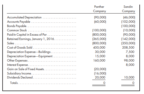 > Refer to the preceding facts for Panther’s acquisition of Sandin common stock. On January 1, 2016, Panther held merchandise sold to it from Sandin for $12,000. This beginning inventory had an applicable gross profit of 25%. During 2016, Sandin sold merch