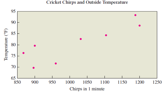 One classic example of a correlation involves the association between the temperature and the number of times a cricket chirps in a minute. The scatter plot in Figure 7.7 on the next page shows the relationship for eight different pairs of values of temperature and rate of chirps. Estimate the correlation coefficient, and determine whether there appears to be a correlation between the temperature and the number of times a cricket chirps in a minute.