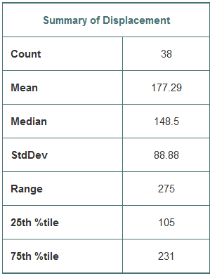 One measure of the size of an automobile engine is its displacement, the total volume (in liters or cubic inches) of its cylinders. Summary statistics for several models of new cars are shown. These displacements were measured in cubic inches.