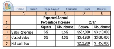 Page Layout B Expected Annual Percentage Increase Square 6% Home Insert Formulas Data Review A D E 1 2017 Cloudburst Square Cloudburst $567,000 $3,510,000 | $364,800 $3,060,000 $202,200 $ 450,000 2 3 Sales Revenues 5.5% 4 Cost of Sales 5% 4.5% 5 Net cash flow