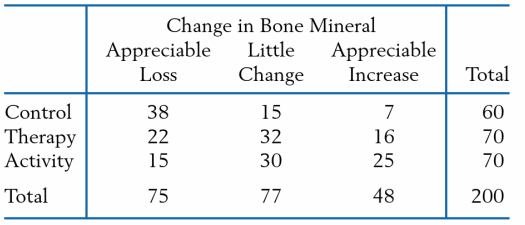 Osteoporosis, or a loss of bone minerals, is a common cause of broken bones in the elderly. A researcher on aging conjectures that bone mineral loss can be reduced by regular physical therapy or certain kinds of physical activity. A study is conducted on 200 elderly subjects of approximately the same age divided into control, physical therapy, and physical activity groups. After a suitable period of time, the nature of change in bone mineral content is observed.