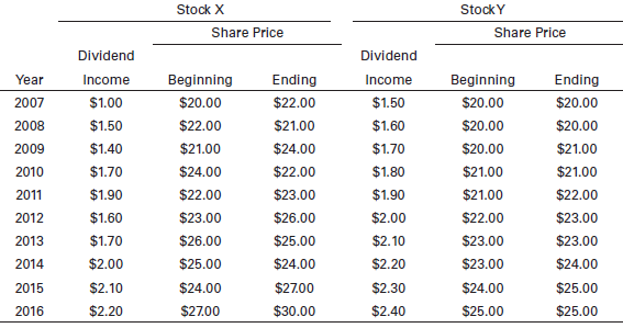 Stock X StockY Share Price Share Price Dividend Dividend Year Income Beginning Ending Income Beginning Ending 2007 $1.00 $20.00 $22.00 $1.50 $20.00 $20.00 2008 $1.50 $22.00 $21.00 $1.60 $20.00 $20.00 2009 $1.40 $21.00 $24.00 $1.70 $20.00 $21.00 2010 $1.70 $24.00 $22.00 $1.80 $21.00 $21.00 2011 $1.90 $22.00 $23.00 $1.90 $21.00 $22.00 2012 $1.60 $23.00 $26.00 $2.00 $22.00 $23.00 2013 $1.70 $26.00 $25.00 $2.10 $23.00 $23.00 2014 $2.00 $25.00 $24.00 $2.20 $23.00 $24.00 2015 $2.10 $24.00 $27.00 $2.30 $24.00 $25.00 2016 $2.20 $27.00 $30.00 $2.40 $25.00 $25.00