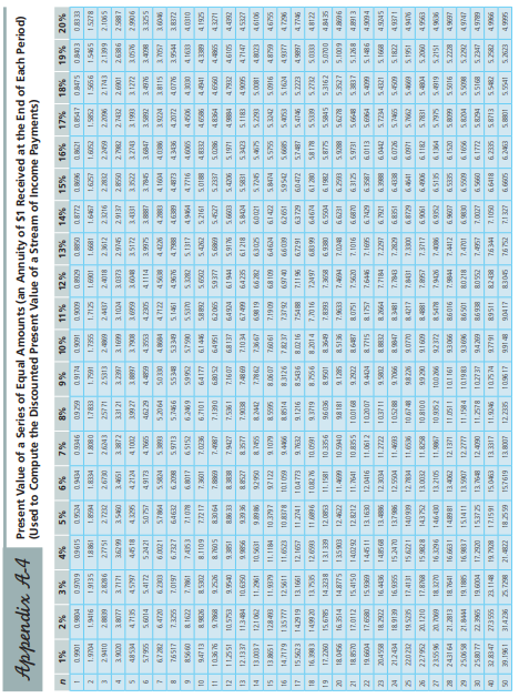 网 SEE6 EZS ISSS 1088S 6.2463 S0999 SPOEB 時166 21 960I 12.2335 L008 EI 6192SI 65SZ BI 31A236 1961'6E ZSS EILBS SEEZ9 BI199 05012 BEZ8 I568 16L6 I EZ 13.3317 ESO SI 165121 55SELZ 32 8347 6BL6 LEZS 89ISS 0995 9 Z5S OB BE6 98 LE LZDI BASZI 12.4090 BL EI SZLESI 009 61 DE 60SS9 BIZOR 1O5 98 9696 IIPISI LE6 91 910SS OZSI 9 91098 990 E6 191 IDI 290 EI 1868I I E99 91 IL BI EIBZ'IZ 19IEDZ 6.5335 7.4412 ISIZS 12. 1371 SUNS SIS RIS 家001 9691 ZE BI 600 2 96SSEZ E956 090ZS IEBL'S 6.1182 909 19069 LILEZ 1888 609 I6 0018 01 ZEDO EI ZSLEI 20.1210 29S 1609 7.8431 18EB 29 01 IZ29 SI SZS 61 I LEG 5. 1822 6OSS OSS ZI 986LEI OLTSI 212434 EZ 6.4338 16.9355 GE16 BI 6.8351 899IS 5.4321 PEZL'S IZ6L9 ZEBB B II LEDI 11.2722 PEDE ZI 89 S8 7.7184 16.4436 18.2922 606 9時5 660S EI 109 L8SE 9 SILLB 12.0416 DE9I EI 6SE6 SI 0859 1 4.8913 8I'S IEL6S SZIE9 91012 ISLOB 89 100I 12.8212 26ZOI 5.3837 15.4150 ZI1021 OLS8 BI 10.8355 9698 600I'S LZSES EE962 SEISB 181 86 12.4622 E06 SEI 16.3514 9SO BI 10.5940 SES 0OLO'S 53162 SSS SUBS SED 96 10.3356 1650 01 II.1581 ES80 ZI 969 GEE IEI BEZEI 61 7.8393 LIS 02 19 66 89 EZZZS ZU09 16Z29 96112 91 Z08 ZEL 6 ELLVOI 1991 EI 8.5436 9.1216 15.5623 19929 60099 26E PIS 650 IDI 91 S59 9160S 601 89 60612 19092 20908 26LE DI 12843 I S98 EI SI 97122 11.1184 9019 1800'S I2009 299 61 69 292 第6 1962'11 290 IZI LZES S606 5.1183 EZES IEBS S BED62 LUSE B SE GEG 9586 6 OSE9 DI 12.1337 EI 61218 64235 4.4392 S019 ZEGL 1261S L165 1 9ES 2 t619 68137 20912 BEBE B ISBE 6 ESIS DI ISSZII ZI 886 33 0959 1SEB LEEZS 69895 LLE65 1569 Z5 089 190EB SZ6I 6BEE I ZEEB 1912S 9中19 Z688S I012'9 SEZOZ 6011'8 ZDES B 90 S009 ESS 2665 629 7453 192 4.3436 EL EEES BESS 99'S EIL6S ZE99 LZEL'9 3.8372 26102 SSZEL LIS9L 4.2072 SIIE OE OS 190S 12009 SSZEE SLE SL66 E SDEZ ESSE EL16 3.5892 9 5.2421 9066Z 2001 445 18 6629E 98E9Z 10697 0S587 LE167 ELED E 6691E 2GEZE ZLBE E ISE 09SE 2.7432 ILILE OZ06 E 331 21 ENIZ Z1 EIESZ 9595I Z5851 Z509'1 1899'I 10691 SZIL'I SSEL'I EEBL'I 0808 I 19881 19135 6060 1.8334 2 0.83 33 IZ98D OS88 D 6Z68 0 6006 D 1606 D 6区60 S1960 1066 D 0.9346 0.9434 %07 %61 16% 17% %SI %EL %L % 01 %6 %E (Used to Compute the Discounted Present Value of a Stream of Income Payments) Present Value of a Series of Equal Amounts (an Annuity of $1 Received at the End of Each Period) Appendix A-4