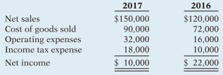 2017 2016 Net sales $150,000 90,000 $120,000 72,000 Cost of goods sold Operating expenses Income tax expense 32,000 18,000 16,000 10,000 Net income $ 10,000 $ 22,000