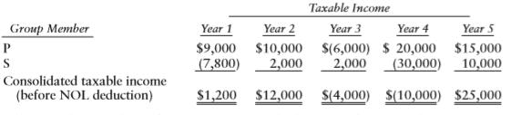 P and S Corporations form in Year 1, with S as Pâs wholly-owned subsidiary. The corporations immediately elect to file consolidated tax returns. The group reports the following results: