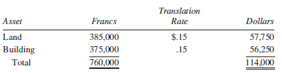 Р Cоmpany (Dollars) SFr Company (Francs) Debits Cash 500,200 962,500 Accounts Receivable 516,400 660,000 Inventories (FIFO cost) 627,800 1,037,500 Investment in SFr Company 297,806 Land 450,000 500,000 Buildings (net) Equipment (net) 610,000 550,000 290,000 405,000 Dividends Declared 200,000 375,000 Cost of Goods Sold 2,720,000 2,312,500 Depreciation Expense Other Expense Income Tax Expense 210,000 125,000 914,000 818,750 100,000 102,500 Totals $7,436,206 7,848,750 Credits Accounts Payable Short-Term Notes Payable Bonds Payable 540,000 800,000 300,000 650,750 700,000 850,000 Common Stock 800,000 960,000 Additional Paid-in Capital 300,000 300,000 Retained Earnings, 1/1 542,878 513,000 Sales 4,200,000 3,775,000 Equity Income 53,328 Totals $7,436,206 7,848,750 Translation Asset Francs Rate Dollars Land 385,000 $.15 57,750 Building 375,000 .15 56,250 Total 760,000 114,000
