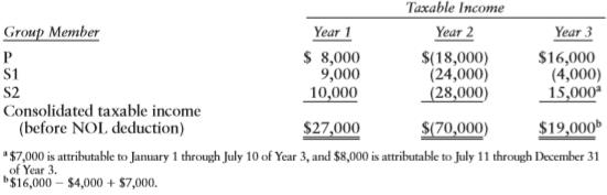 Taxable Income Year 2 Group Member Year 1 $ 8,000 9,000 10,000 Year 3 S1 S2 Consolidated taxable income (before NOL deduction) $(18,000) (24,000) (28,000) $16,000 (4,000) 15,000 $27,000 $(70,000) $19,000 "$7,000 is attributable to January 1 through July 10 of Yeur 3, and $8,000 is attributable to July 11 through December 31 of Year 3. $16,000 - $4,000 + $7,000.