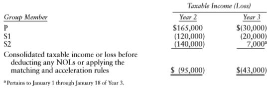 Taxable Income (Loss) Group Member Year 2 Year 3 P S1 S2 $165,000 (120,000) (140,000) $(30,000) (20,000) 7,000 Consolidated taxable income or loss before deducting any NOLS or applying the matching and acceleration rules * Pertains to January 1 through January 18 of Year 3. $ (95,000) $(43,000)