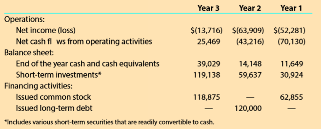 Year 3 Year 2 Year 1 Operations: Net income (loss) $(13,716) $(63,909) $(52,281) Net cash fl ws from operating activities 25,469 (43,216) (70,130) Balance sheet: End of the year cash and cash equivalents 39,029 14,148 11,649 Short-term investments* 119,138 59,637 30,924 Financing activities: Issued common stock 118,875 62,855 Issued long-term debt 120,000 "Includes various short-term securities that are readily convertible to cash.