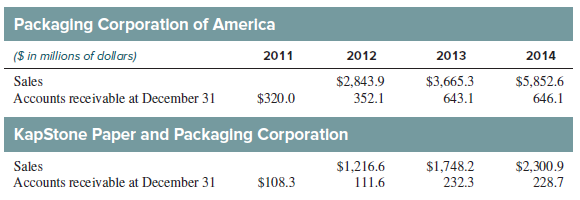 Packaging Corporation of America (S in millions of dollars) 2011 2012 2013 2014 Sales $2,843.9 $3,665.3 $5,852.6 Accounts receivable at December 31 $320.0 352.1 643.1 646.1 KapStone Paper and Packaging Corporation Sales $1,216.6 $1,748.2 232.3 $2,300.9 Accounts receivable at December 31 $108.3 111.6 228.7
