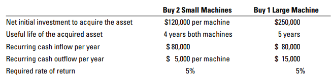 Buy 2 Small Machines Buy 1 Large Machine Net initial investment to acquire the asset $120,000 per machine $250,000 Useful life of the acquired asset 4 years both machines 5 years $ 80,000 $ 5,000 per machine $ 80,000 $ 15,000 Recurring cash inflow per year Recurring cash outflow per year Required rate of return 5% 5%