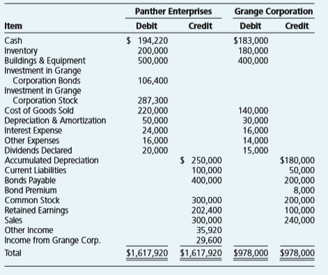 Panther Enterprises Grange Corporation Item Debit Credit Debit Credit $ 194,220 200,000 500,000 $183,000 180,000 400,000 Cash Inventory Buildings & Equipment Investment in Grange Corporation Bonds Investment in Grange Corporation Stock Cost of Goods Sold Depreciation & Amortization Interest Expense Other Expenses Dividends Declared Accumulated Depreciation Current Liabilities 106,400 287,300 220,000 50,000 24,000 16,000 20,000 140,000 30,000 16,000 14,000 15,000 $ 250,000 100,000 400,000 $180,000 50,000 200,000 8,000 200,000 100,000 240,000 Bonds Payable Bond Premium Common Stock 300,000 202,400 300,000 35,920 29,600 Retained Earnings Sales Other Income Income from Grange Corp. Total $1,617,920 $1,617,920 $978,000 $978,000