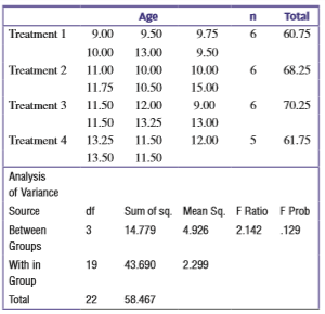 Age n Total Treatment 1 9.00 9.50 9.75 6 60.75 10.00 13.00 9.50 Treatment 2 11.00 10.00 10.00 6 68.25 11.75 10.50 15.00 Treatment 3 11.50 12.00 9.00 6 70.25 11.50 13.25 13.00 Treatment 4 13.25 11.50 12.00 61.75 13.50 11.50 Analysis of Variance Source df Sum of sq. Mean Sq. FRatio F Prob Between 3 14.779 4.926 2.142 .129 Groups With in 19 43.690 2.299 Group Total 22 58.467