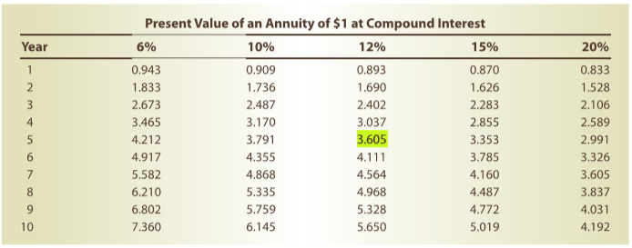 Present Value of an Annuity of $1 at Compound Interest Year 6% 10% 12% 15% 20% 1 0.943 0.909 0.893 0.870 0.833 1.833 1.736 1.690 1.626 1.528 2.673 2.487 2.402 2.283 2.106 4 3.465 3.170 3.037 2.855 2.589 4.212 3.791 3.605 3.353 2.991 4.917 4.355 4.111 3.785 3.326 5.582 4.868 4.564 4.160 3.605 6.210 5.335 4.968 4.487 3.837 6.802 5.759 5.328 4.772 4.031 10 7.360 6.145 5.650 5.019 4.192