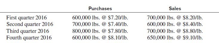 Purchases Sales First quarter 2016 Second quarter 2016 Third quarter 2016 Fourth quarter 2016 700,000 lbs. @ $8.20/lb. 600,000 lbs. @ $8.40/lb. 700,000 lbs. @ $8.80/lb. 650,000 lbs. @ $9.10/lb. 600,000 lbs. @ $7.20/lb. 700,000 lbs. @ $7.40/lb. 800,000 lbs. @ $7.80/lb. 600,000 lbs. @ $8.10/lb.