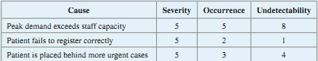 Patients at an emergency room in a large urban hospital frequently experience long wait times before they actually see a physician. The hospital has decided to use FMEA to determine an action plan for addressing the problem, defining a âfailureâ as a wait time of 30 minutes or longer. A group study has produced the following data:
