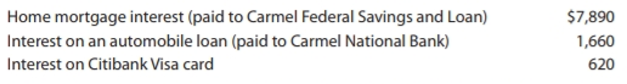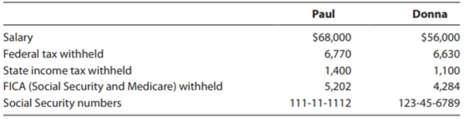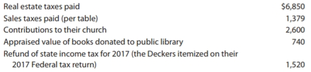 Paul Donna Salary $68,000 $56,000 Federal tax withheld 6,770 6,630 State income tax withheld 1,400 1,100 FICA (Social Security and Medicare) withheld Social Security numbers 5,202 4,284 111-11-1112 123-45-6789 Larry Jane Age 17 18 Social Security numbers 123-45-6788 123-45-6787 Months spent with Deckers $7,890 Home mortgage interest (paid to Carmel Federal Savings and Loan) Interest on an automobile loan (paid to Carmel National Bank) 1,660 Interest on Citibank Visa card 620 Real estate taxes paid $6,850 Sales taxes paid (per table) 1,379 Contributions to their church 2,600 Appraised value of books donated to public library 740 Refund of state income tax for 2017 (the Deckers itemized on their 2017 Federal tax return) 1,520
