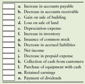 a. Increase in accounts payable b. Decrease in accounts receivable c. Gain on sale of building d. Loss on sale of land c. Depreciation expense f. Increase in inventory g. Issuance of common stock h. Decrease in accrued liabilities i. Net income j. Decrease in prepaid expense k. Collection of cash from customers 1. Purchase of cquipment with cash m. Retained carnings n. Payment of dividends
