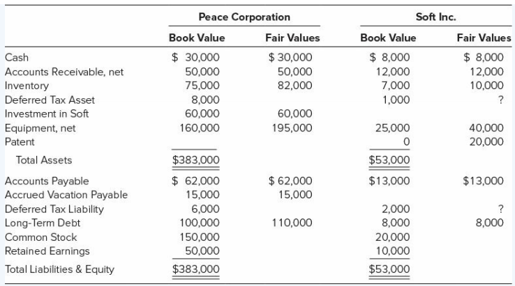 Peace Corporation Soft Inc. Book Value Fair Values Book Value Fair Values Cash $ 30,000 $ 30,000 $ 8,000 $ 8,000 Accounts Receivable, net Inventory 50,000 50,000 12,000 12,000 75,000 82,000 7,000 10,000 Deferred Tax Asset 8,000 60,000 1,000 Investment in Soft 60,000 195,000 Equipment, net Patent 40,000 20,000 160,000 25,000 Total Assets $383,000 $53,000 $ 62,000 $ 62,000 15,000 Accounts Payable Accrued Vacation Payable Deferred Tax Liability Long-Term Debt $13,000 $13,000 15,000 6,000 100,000 2,000 8,000 ? 110,000 8,000 20,000 10,000 Common Stock 150,000 Retained Earnings 50,000 Total Liabilities & Equity $383,000 $53,000