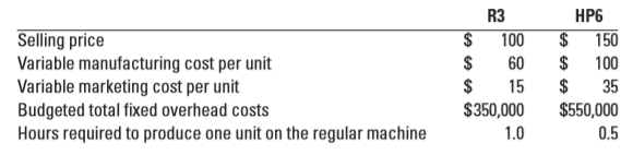 R3 HP6 Selling price Variable manufacturing cost per unit Variable marketing cost per unit Budgeted total fixed overhead costs Hours required to produce one unit on the regular machine 100 $ 150 $ $ $ 60 100 15 $ 35 $350,000 $550,000 1.0 0.5