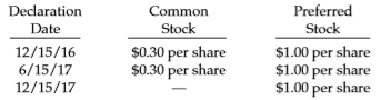> Hatch Company has two classes of capital stock outstanding: 8%, $20 par preferred and $5 par common. At December 31, 2017, the following accounts were included in stockholders’ equity. Preferred Stock, 150,000 shares…………………………..$ 3,000,000 Common Stock