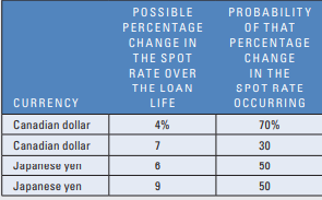 The interest rate on the Canadian dollar is 9Â percent, and the interest rate on the Japanese yen is 7Â percent. Develop the possible effective financing rates of the overall portfolio and the probability of each possibility based on the use of joint probabilities