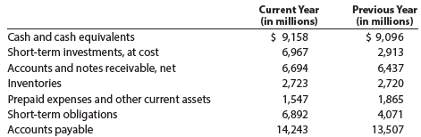 Current Year (in millions) Previous Year (in millions) $ 9,158 6,967 $ 9,096 Cash and cash equivalents Short-term investments, at cost 2,913 Accounts and notes receivable, net 6,694 6,437 Inventories 2,723 2,720 Prepaid expenses and other current assets Short-term obligations Accounts payable 1,547 1,865 4,071 6,892 14,243 13,507