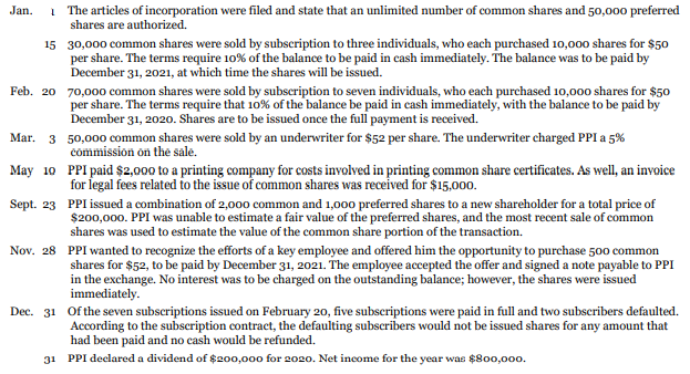 1 The articles of incorporation were filed and state that an unlimited number of common shares and 50,000 preferred shares are authorized. Jan. 15 30,000 common shares were sold by subscription to three individuals, who each purchased 10,00o shares for $50 per share. The terms require 10% of the balance to be paid in cash immediately. The balance was to be paid by December 31, 2021, at which time the shares will be issued. Feb. 20 70,000 common shares were sold by subscription to seven individuals, who each purchased 10,000 shares for $50 per share. The terms require that 10% of the balance be paid in cash immediately, with the balance to be paid by December 31, 2020. Shares are to be issued once the full payment is received. 3 50,000 common shares were sold by an underwriter for $52 per share. The underwriter charged PPI a 5% Mar. commission on the sale. May 10 PPI paid $2,000 to a printing company for costs involved in printing common share certificates. As well, an invoice for legal fees related to the issue of common shares was received for $15,000. Sept. 23 PPI issued a combination of 2,000 common and 1,000 preferred shares to a new shareholder for a total price of $200,000. PPI was unable to estimate a fair value of the preferred shares, and the most recent sale of common shares was used to estimate the value of the common share portion of the transaction. Nov. 28 PPI wanted to recognize the efforts of a key employee and offered him the opportunity to purchase 500 common shares for $52, to be paid by December 31, 2021. The employee accepted the offer and signed a note payable to PPI in the exchange. No interest was to be charged on the outstanding balance; however, the shares were issued immediately. Dec. 31 Of the seven subscriptions issued on February 20, five subscriptions were paid in full and two subscribers defaulted. According to the subscription contract, the defaulting subscribers would not be issued shares for any amount that had been paid and no cash would be refunded. 31 PPI declared a dividend of $200,000 for 2020. Net income for the year was $800,000.