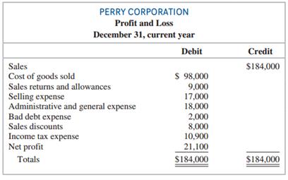 PERRY CORPORATION Profit and Loss December 31, current year Debit Credit Sales S184,000 $ 98,000 9,000 17,000 18,000 Cost of goods sold Sales returns and allowances Selling expense Administrative and general expense Bad debt expense Sales discounts Income tax expense Net profit 2,000 8,000 10,900 21,100 Totals $184,000 $184,000