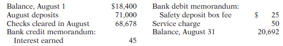 Balance, August 1 August deposits Checks cleared in August Bank credit memorandum: $18,400 71,000 68,678 Bank debit memorandum: Safety deposit box fee Service charge Balance, August 31 $ 25 50 20,692 Interest earned 45