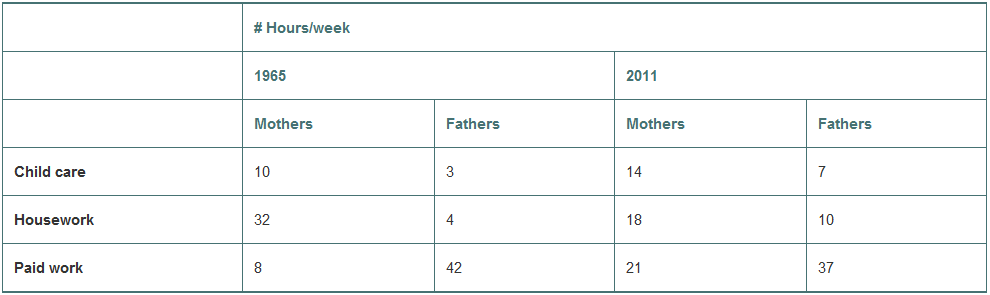 Pew Research (www.pewsocialtrends.org/2013/03/14/modern-parenthood-roles-of-moms-and-dads converge-as-they-balance-work-and-family/) surveyed parents and asked how many hours they spent in various activities. They compared 2011 responses with those from a 1965 survey. Here are the results: