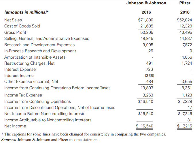 Pfizer Inc. is a US company that manufactures and distributes pharmaceutical and consumer healthcare products that are similar to those sold by Johnson & Johnson. Use the excerpts of Johnson & Johnsonâs and Pfizerâs income statements to answer the following questions: