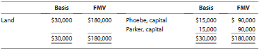 Basis FMV Basis FMV Land $30,000 $180,000 $ 90,000 Phoebe, capital Parker, capital $15,000 15,000 $30,000 000'06 $180,000 $30,000 $180,000