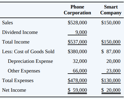 Phone Smart Corporation Company Sales $528,000 $150,000 Dividend Income 9,000 Total Income $537,000 $150,000 Less: Cost of Goods Sold $380,000 $ 87,000 Depreciation Expense 32,000 20,000 Other Expenses 66,000 23,000 Total Expenses $478,000 $130,000 Net Income $ 59,000 $ 20,000