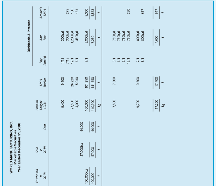 WORLD MANUFACTURING, INC. Marketable Securities Year Ended December 31, 2018 Dividends & Interest Purchased General PIos 12/31 Market Amt. Rec. 2018 2018 12/31 sjoniɔɔy Date(s) 12/31 1/15 00L'6 p'qo0E 7/15 275 27,500 p'qo0E 26,220 12/1 5,080 p'qooz'L 8/1 188 p'qost ɔʻq000'LS 000'99 100,000c,e 101,250 7/1 000's 5,563 p'qo00's 141,650 7,250 C00'00L 000'LS 000'99 3/1 cos'L 009'L p'qosL L/9 p'qosL L/6 12/1 p'qosL 250 p'qosL COL'6 008'6 p'qo08 8/1 667 p'q008 17,200 17,400 917 009'7 Face General Description of Security Serial No. anjoA of Bonds Ledger dio) Bonds Yr. Due A 2023 21-7 9,400a 9 000'0L 2019 4. 6. 2024 OEL 16-4 27,500a 000'0E 4,000a 000's R. 2021 08-2 000'0L 2026 07-4 000'001 106,900a s'e Stocks P 1,000 shs. 1,044 7,500a u cwwo) U 50 shs. 8,530 9,700a u owwo) 17,200 Legends and comments relative to above schedule: a- Beginning balances agreed to prior yoar working papers. b- Traced to cash recelpts. C- Board of directors' minutes examined-purchases and sales approved. d- Agreed to 1099. eConfirmed by tracing to broker's advice. f= Totals footed. g= Agreed to general ledger.