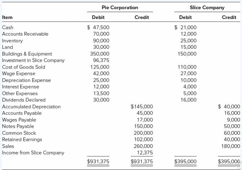 Pie Corporation Slice Company Item Debit Credit Debit Credit Cash $ 47,500 $ 21,000 Accounts Receivable 70,000 12,000 Inventory 90,000 30,000 350,000 25,000 15,000 Land Buildings & Equipment Investment in Slice Company Cost of Goods Sold 150,000 96,375 125,000 110,000 27,000 Wage Expense Depreciation Expense Interest Expense Other Expenses Dividends Declared 42,000 25,000 10,000 4,000 12,000 13,500 30,000 5,000 16,000 $ 40,000 16,000 Accumulated Depreciation Accounts Payable Wages Payable Notes Payable $145,000 45,000 17,000 150,000 9,000 50,000 60,000 40,000 Common Stock 200,000 102,000 Retained Earnings Sales 260,000 12,375 180,000 Income from Slice Company $931,375 $931,375 $395,000 $395,000