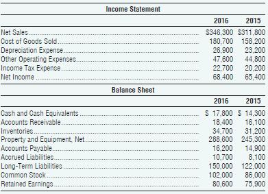 Income Statement 2016 2015 Net Sales. S346,300 S311,800 Cost of Goods Sold . 180,700 158,200 Depreciation Expense. Other Operating Expenses. Income Tax Expense. Net Income 26.900 23,200 47,600 44,800 22,700 20,200 68,400 65,400 Balance Sheet 2016 2015 Cash and Cash Equivalents S 17,800 S 14,300 Accounts Receivable. 18,400 16,100 Inventories. 34,700 288,600 245,300 31,200 Property and Equipment, Net. Accounts Payable. Accrued Liabilities. Long-Term Liabilities Common Stock 16,200 10,700 14,900 8,100 150,000 122,000 102,000 86,000 Retained Earnings. 80,600 75,900