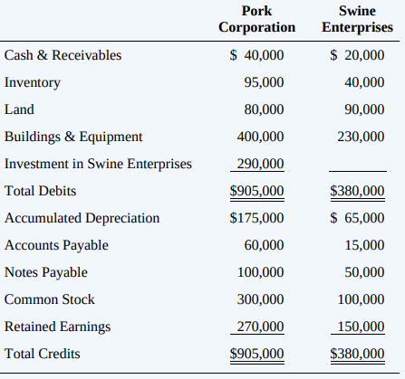 Pork Swine Corporation Enterprises Cash & Receivables $ 40,000 $ 20,000 Inventory 95,000 40,000 Land 80,000 90,000 Buildings & Equipment 400,000 230,000 Investment in Swine Enterprises 290,000 Total Debits $905,000 $380,000 Accumulated Depreciation $175,000 $ 65,000 Accounts Payable 60,000 15,000 Notes Payable 100,000 50,000 Common Stock 300,000 100,000 Retained Earnings 270,000 150,000 Total Credits $905,000 $380,000