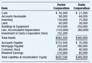 Porter Darla Item Corporation Corporatlon $ 50,300 90,000 130,000 60,000 410,000 (150,000) 102,200 $692,500 $ 21,000 44,000 75,000 30,000 250,000 (80,000) Cash Accounts Receivable Inventory Land Buildings & Equipment Less: Accumulated Depreciation Investment in Darla Corporation Stock Total Assets Accounts Payable Mortgage Payable Common Stock Retained Earnings Total Liabilities & Stockholders' Equity $152,500 250,000 80,000 210,000 $340,000 $ 35,000 180,000 40,000 85,000 $692,500 $340,000