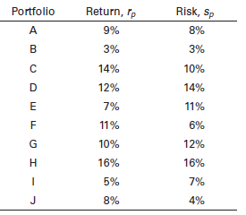 Portfolio Return, rp Risk, Sp A 9% 8% B 3% 3% 14% 10% D 12% 14% 7% 11% F 11% 6% G 10% 12% 16% 16% 5% 7% J 8% 4%