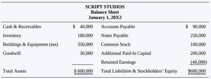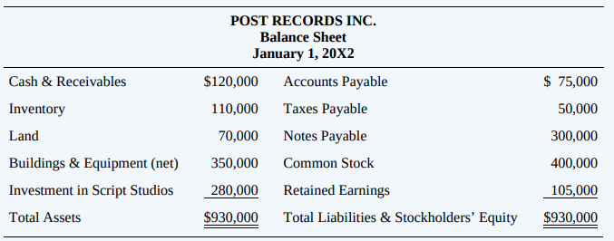 POST RECORDS INC. Balance Sheet January 1, 20X2 Cash & Receivables $120,000 Accounts Payable $ 75,000 Inventory 110,000 Taxes Payable 50,000 Land 70,000 Notes Payable 300,000 Buildings & Equipment (net) 350,000 Common Stock 400,000 Investment in Script Studios 280,000 Retained Earnings 105,000 Total Assets $930,000 Total Liabilities & Stockholders’ Equity $930,000 SCRIPT STUDIOS Balance Sheet January 1, 20X2 Cash & Receivables $ 40,000 Accounts Payable $ 90,000 Inventory 180,000 Notes Payable 250,000 Buildings & Equipment (net) 350,000 Common Stock 100,000 Goodwill 30,000 Additional Paid-In Capital 200,000 Retained Earnings (40,000) Total Assets $ 600,000 Total Liabilities & Stockholders' Equity $600,000