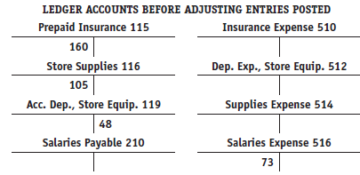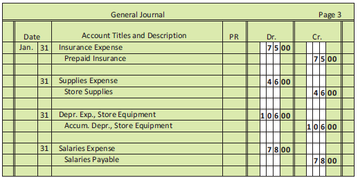 LEDGER ACCOUNTS BEFORE ADJUSTING ENTRIES POSTED Prepaid Insurance 115 Insurance Expense 510 160 Store Supplies 116 Dep. Exp., Store Equip. 512 105 Асс. Dep., Store Equip. 119 Supplies Expense 514 48 Salaries Payable 210 Salaries Expense 516 73 General Journal Page 3 Date Account Titles and Description PR Dr. Cr. Jan. 31 Insurance Expense 75 00 Prepaid Insurance 75 00 31 Supplies Expense 4600 Store Supplies 4 600 31 Depr. Exp., Store Equipment 10600 Accum. Depr., Store Equipment 10600 31 Salaries Expense z8 00 Salaries Payable 78 00