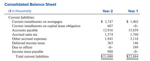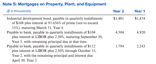 In connection with these mortgages, the company is required to maintain minimum net worthand comply with other financial covenants, including a restriction limiting loans to officers to lessthan $2,000,000. At December 31, Year 2, the company is in compliance with these covenants. The $1,794,000 note payable to bank due on April 30, Year 3, is classified as a current liabilityat December 31, Year 2. The aggregate maturities of mortgages are as follows ($ in thousands):