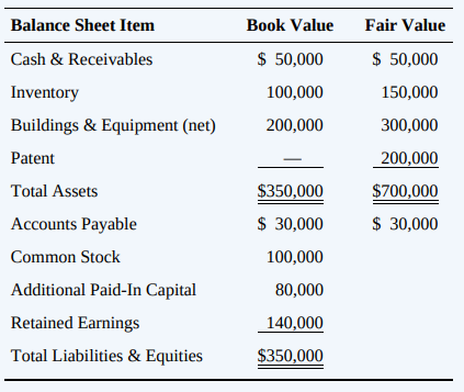 Balance Sheet Item Book Value Fair Value Cash & Receivables $ 50,000 $ 50,000 Inventory 100,000 150,000 Buildings & Equipment (net) 200,000 300,000 Patent 200,000 Total Assets $350,000 $700,000 Accounts Payable $ 30,000 $ 30,000 Common Stock 100,000 Additional Paid-In Capital 80,000 Retained Earnings 140,000 Total Liabilities & Equities $350,000