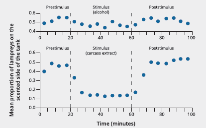 Predation by sea lampreys on native fishes in the Great Lakes is an ongoing problem. To help solve it, Michael Wagner and his team test methods of repelling lampreys. They carried out an experiment to investigate reports that sea lampreys detect the scent of lamprey carcasses and tend to avoid them. The researchers made alcohol-based lamprey carcass extracts, then observed what happened when lampreys were put in tanks and exposed to either this extract or to alcohol alone. FIGURE 25.6 shows their results.