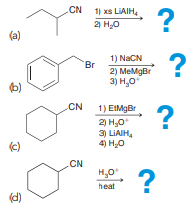 CN 1) xs LIAIH, 2 H0 ? (a) 1) NaCN 2) MeMgBr 3) H,0 ? Br (6) CN 1) EIMgBr ? 2) H,O 3) LIAIH, 4) H,0 (c) CN H,0 ? heat (d)