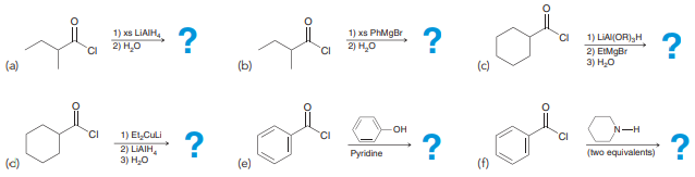 1) xs LIAIH, 2) H,0 ? 1) xs PhMgBr 2) H,0 1) LIAI(OR),H ? CI 2) EIMgBr 3) Н,О (b) (c) OH N-H "CI 1) El,CuLi ? CI 2) LIAIH, 3) H,0 Pyridine (two equivalents) (e) (f)