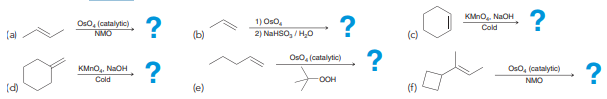 ? KMno NaOH Oso, (catalytic) NMO 1) Oso, 2) NaHSO, / H,0 ? Cold (al (b) (c) ? Os0, (catalytic) ? ? KMNO,, NaOH Os0, (catalytic) Cold OO- NMO (d) (e) (f)