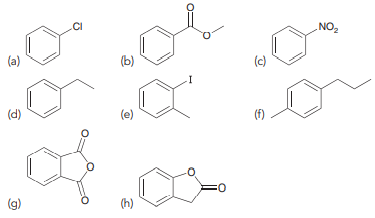 > Predict the product(s) obtained when each of the following compounds is treated with a mixture of nitric acid and sulfuric acid: Br NO2 (a) (h) (c) OMe (d) (e)